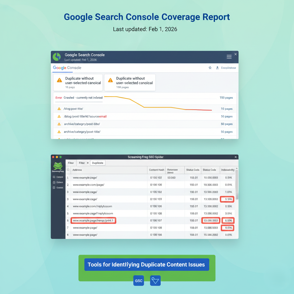 Session IDs, tracking parameters, and filter queries (?sort=date) create duplicate URLs pointing to the same content.